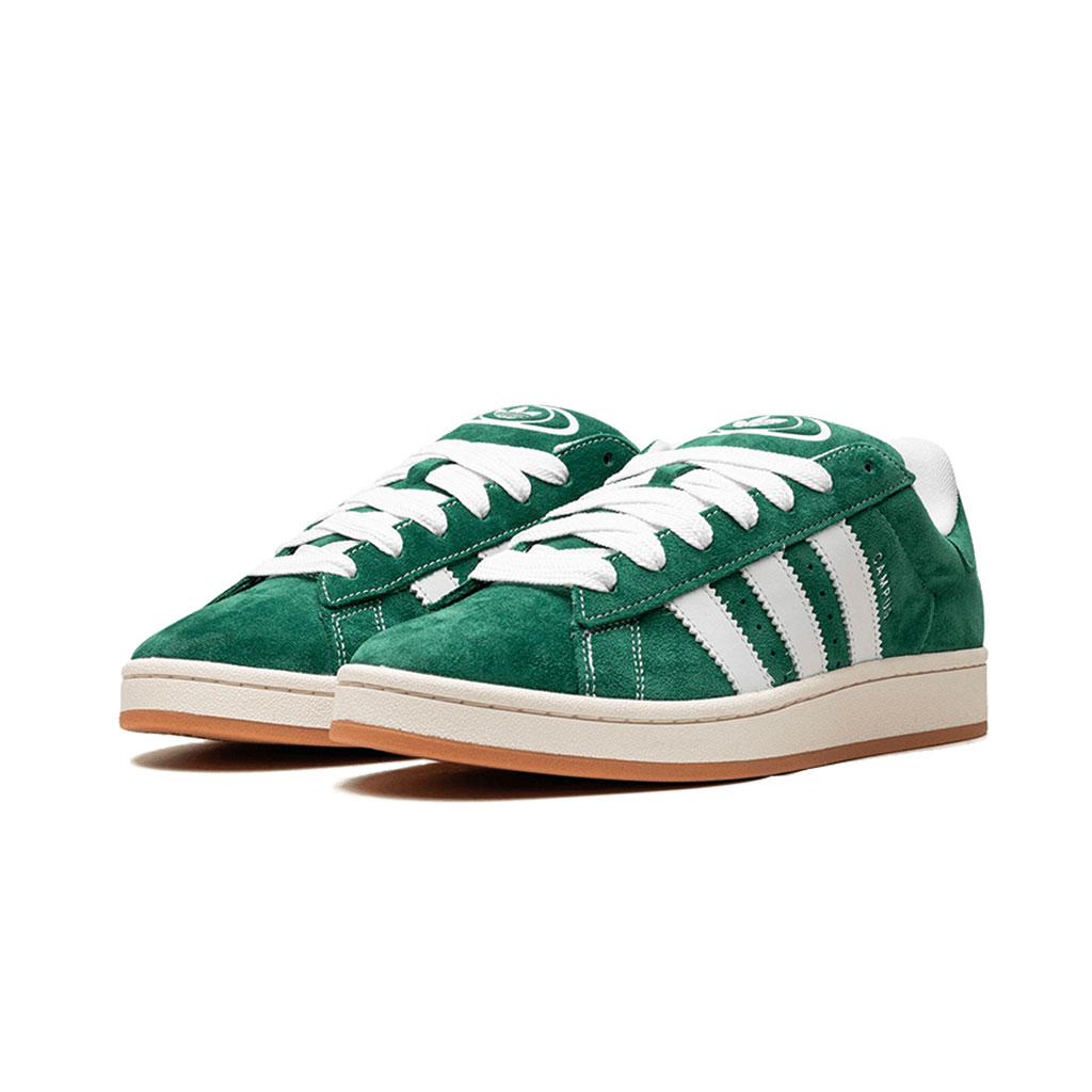 La Adidas Campus 00s Dark Green Cloud White affiche une empeigne en cuir vert, mettant en avant les trois bandes blanches emblématiques sur le panneau latéral, en parfaite harmonie avec le heel tab. Inspirée de la Campus 80s, cette sneaker révèle une semelle jaunie, créant un effet vintage, et une outsole en gomme assortie. Une fusion de style contemporain et de réminiscences rétro pour un look distinctif.