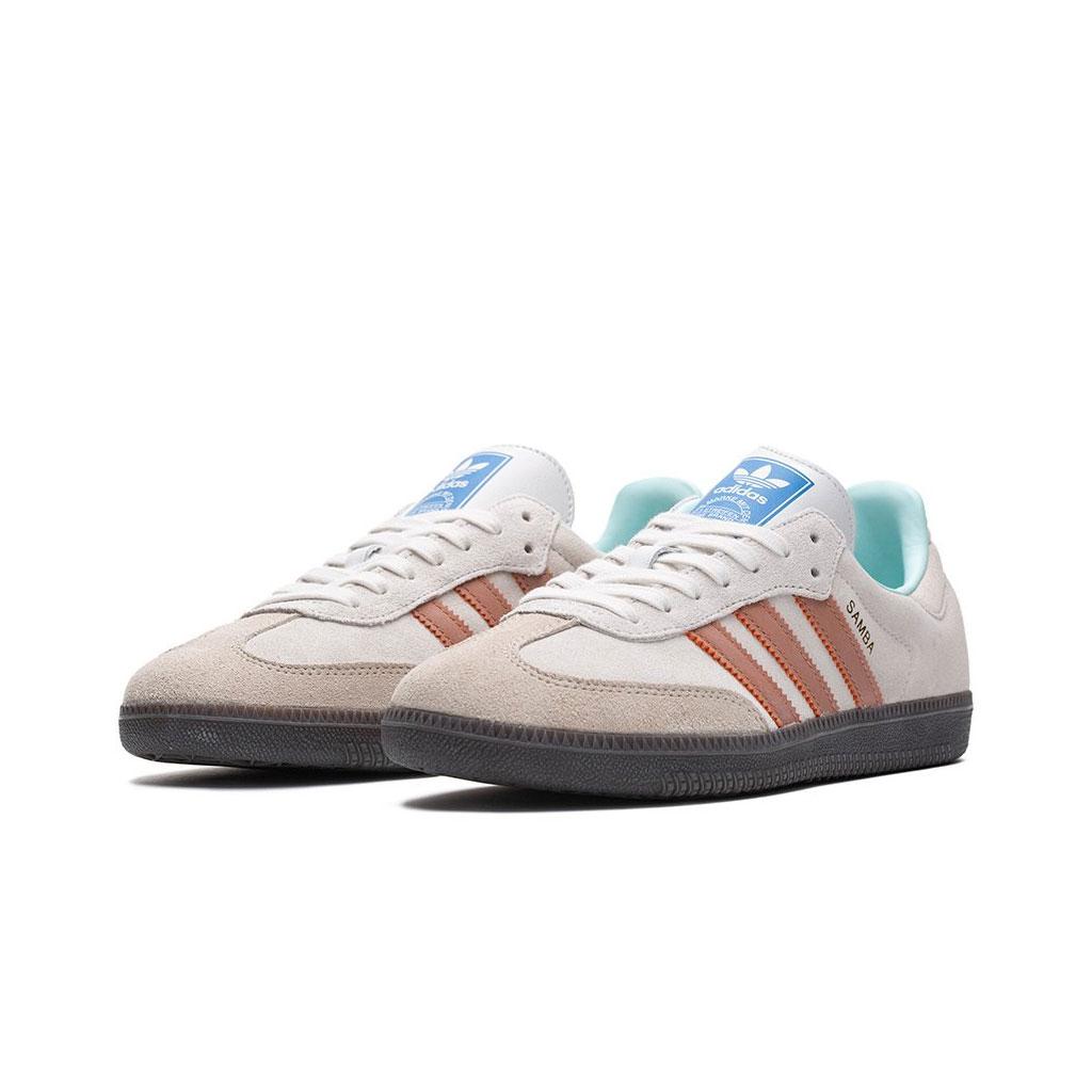 La adidas Samba OG "strate d'argile" présente une esthétique épurée, inspirée de la culture du football américain de Los Angeles. Son empeigne est réalisée en daim, complétée par une semelle extérieure traditionnelle en caoutchouc.