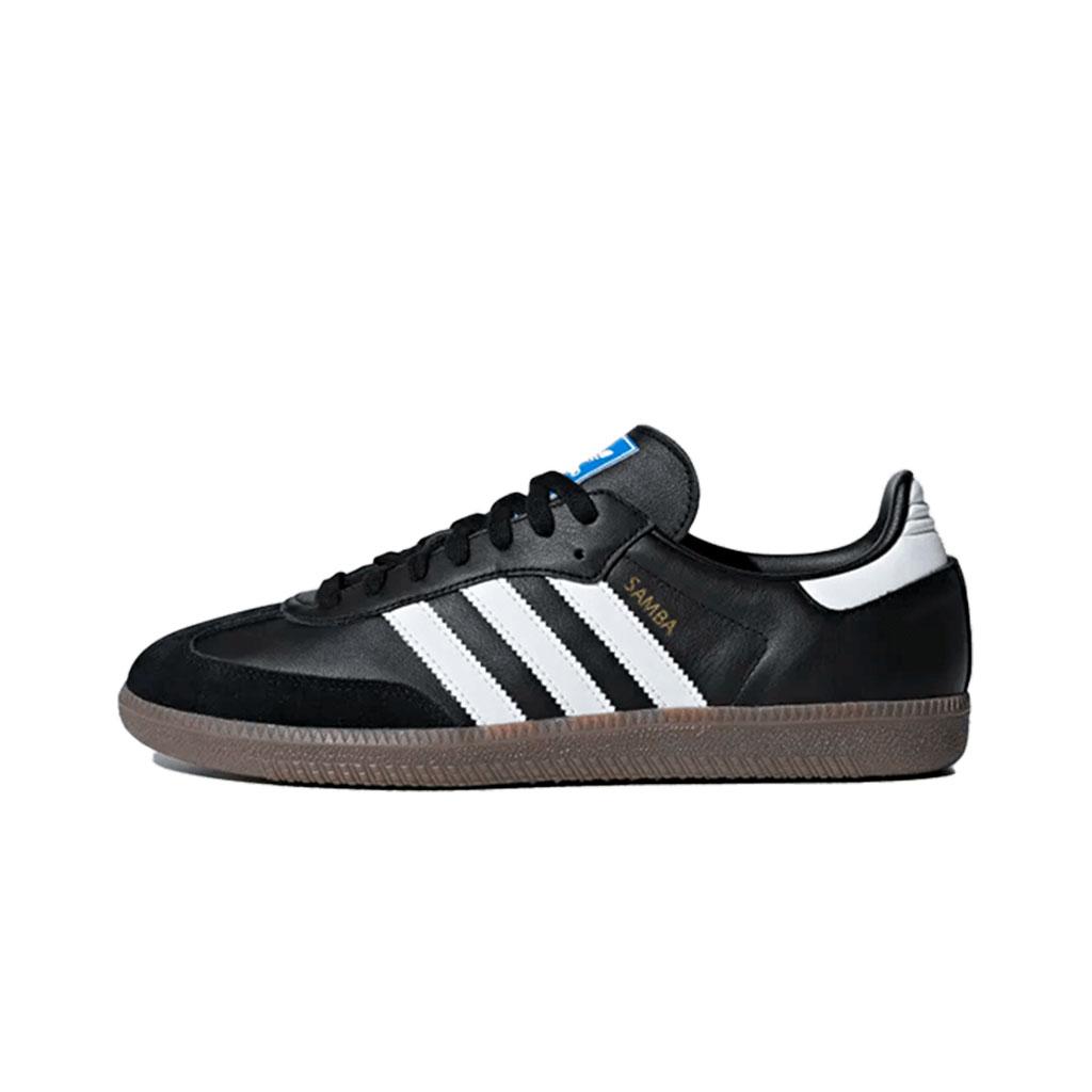 La Adidas Samba OG Core Black présente une empeigne en cuir pleine fleur noir, associée à un mudguard en suède assorti. Des touches dorées, telles que le logo "Samba" sur le panneau latéral et les trois bandes blanches sur le heeltab, ajoutent une touche de raffinement. Le tout repose sur une semelle extérieure en gomme. Cette sneaker est un incontournable du streetwear, alliant style et élégance.