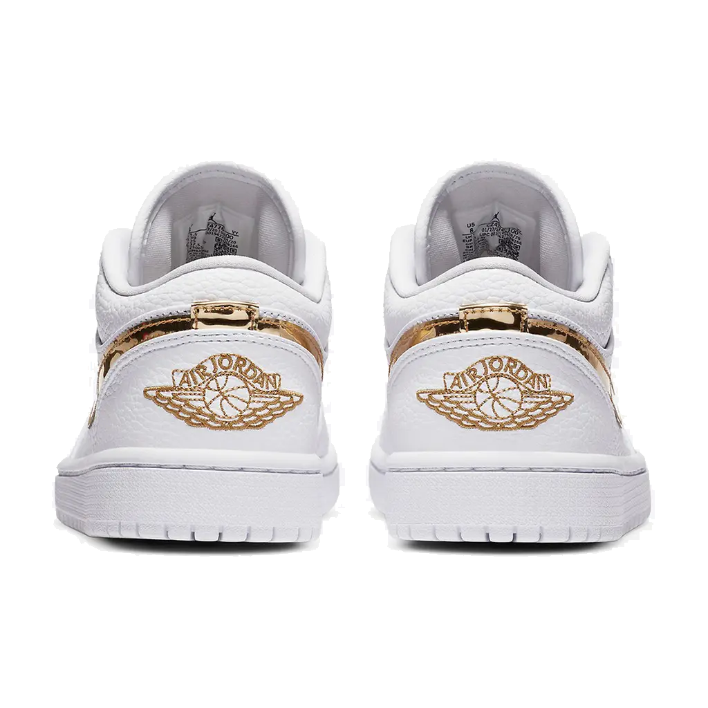 La Air Jordan 1 Low White Metallic Gold (W) est une sneaker élégante pour femmes, mettant en avant une palette de couleurs raffinée mêlant or métallisé et blanc.