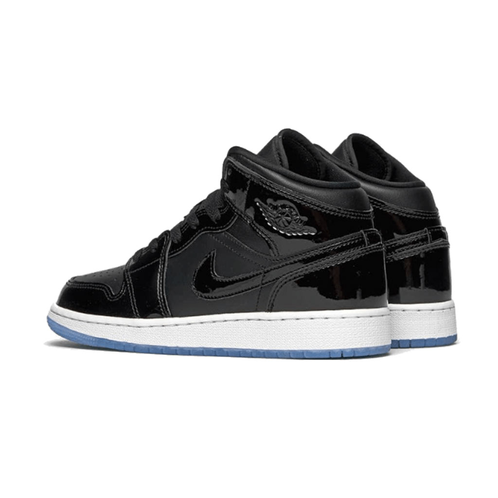 La Air Jordan 1 Mid Space Jam propose une tige noire alliant cuir lisse et cuir verni. Agrémentée de brandings subtils, cette sneaker midtop arbore un logo Jumpman violet, rappelant le modèle emblématique de 1995. En restant fidèle à l'original, elle est dotée d'une semelle blanche avec une outsole translucide.