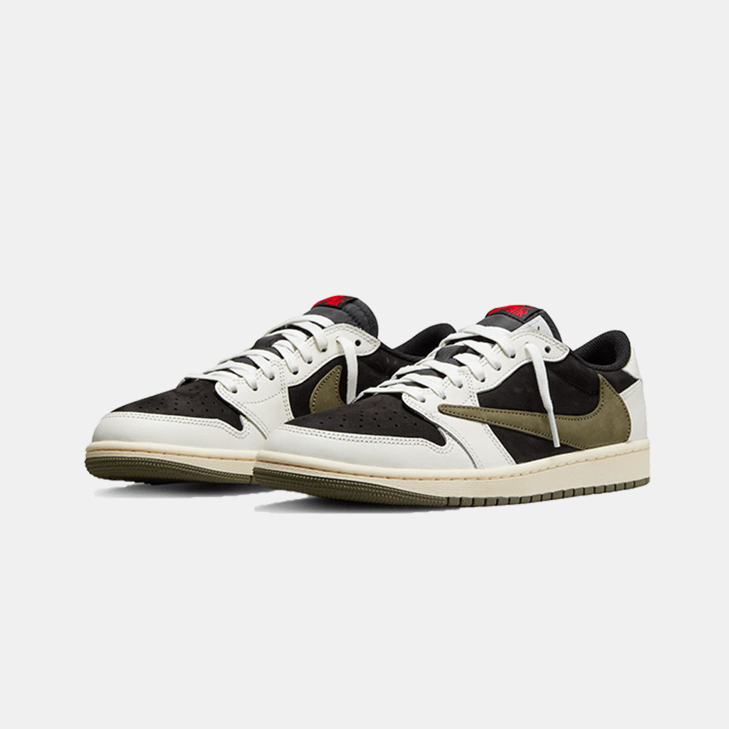 La Air Jordan 1 Retro Low OG SP Travis Scott Olive offre une base en daim premium noir. Les superpositions en cuir blanc cassé enveloppent l'empeigne et se marient aux lacets. Les panels se distinguent par le swoosh inversé vert olive, en harmonie avec la semelle extérieure. Du côté des brandings, le logo Wings brodé au talon et le Nike Air de la languette adoptent une teinte rouge vif. L'ensemble repose sur une midsole beige au charme vintage. Une interprétation distinctive de la Air Jordan 1 par Travis Scott.
