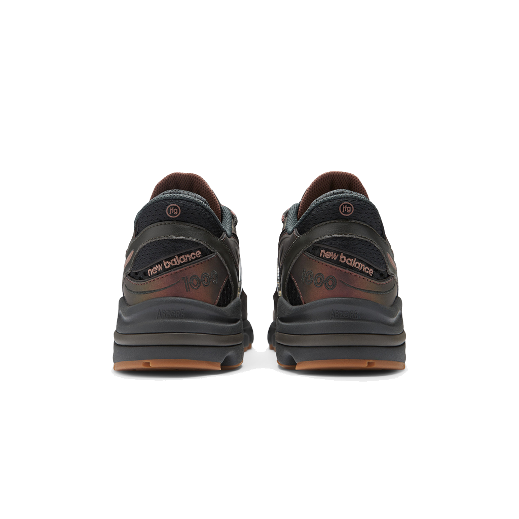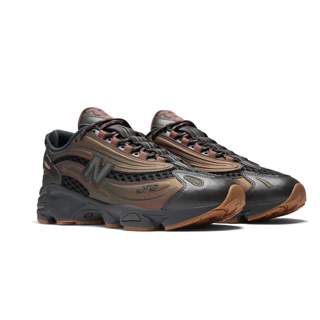 La tige, la semelle intermédiaire et les détails en cuir arborent une teinte noire, tandis que les empiècements en cuir renforcés présentent un effet irisé marron, changeant de couleur selon la lumière. Les détails de branding incluent un petit logo "N" en cuir sur le panneau latéral, "JFG" brodé sur les superpositions, et un double marquage sur la languette.
