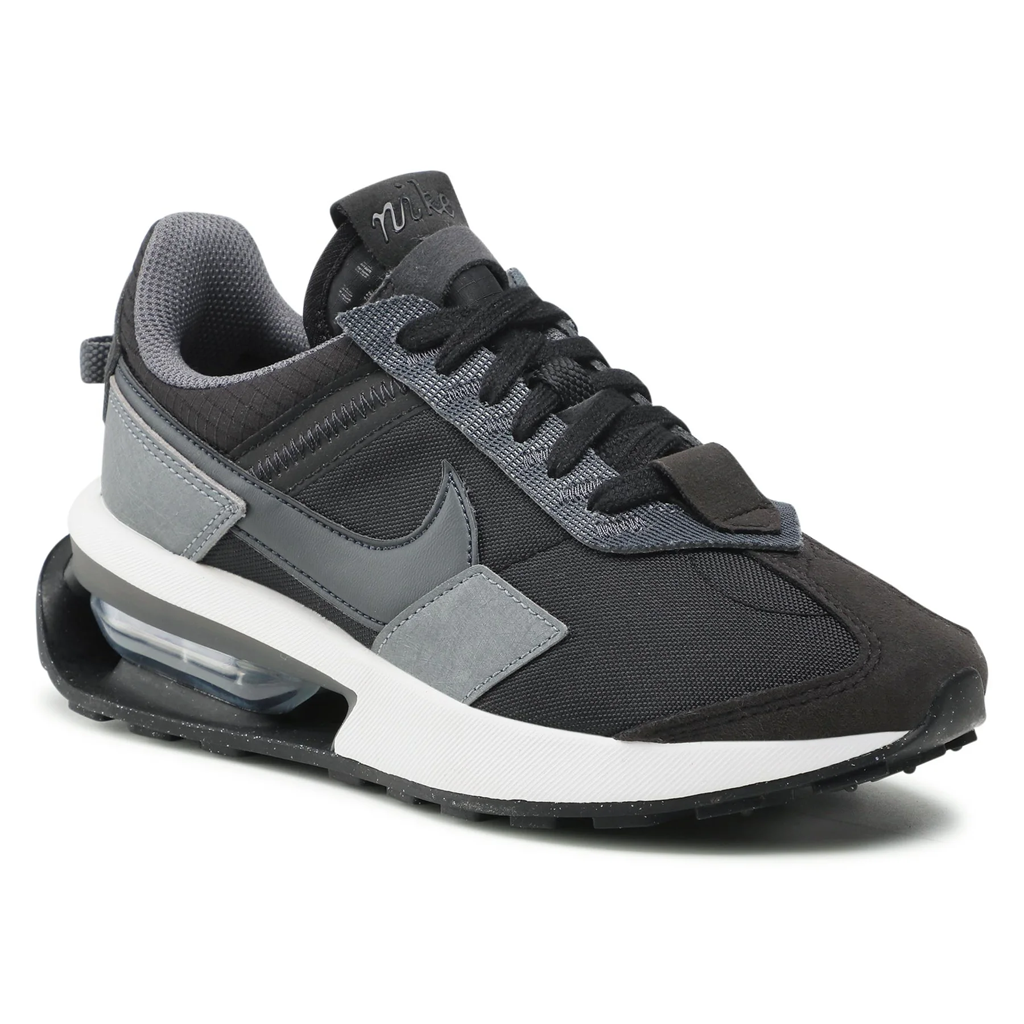 La Nike Air Max Pre-Day Black Grey présente une base en mesh, agrémentée de touches de noir et de gris sur le Swoosh, la languette et la semelle extérieure. Côté branding, un logo Nike vintage s'affiche. Une unité Air-Sole, inspirée de la Air Max 1, vient compléter l'ensemble. À noter que cette sneaker est partiellement fabriquée à partir de matériaux recyclés, du mesh et suède de l’upper à la semelle extérieure.