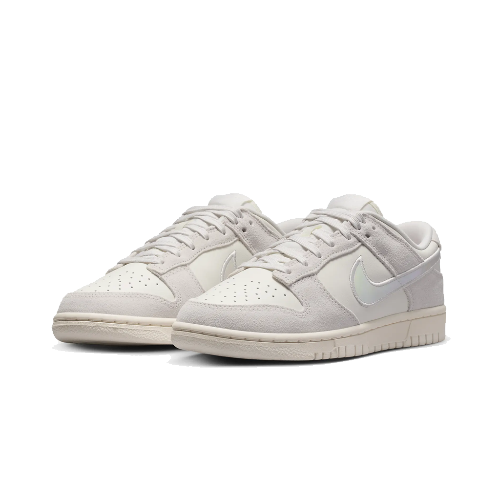 Cette version de la Nike Dunk Low est dotée d’une tige en cuir. La couleur dominante est le blanc cassé "Sail", présent sur la boîte à orteils perforée, la semelle intermédiaire et une partie du talon. Des empiècements en daim dans une teinte plus foncée de blanc cassé recouvrent le bout de la chaussure et s’étendent de la cheville jusqu’au talon. Le célèbre swoosh de Nike apparaît sur chaque côté de la chaussure dans une finition irisée multicolore, dont les reflets changent selon l’angle de la lumière. Le mot "Nike" est brodé sur le col du talon avec un fil irisé, tandis qu’un patch discret du logo Nike orne la languette. Une semelle extérieure en caoutchouc blanc cassé complète le design.